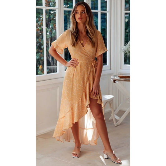 Women's New Fashion Retro Print Tie Short-sleeved Sexy Midi Dress