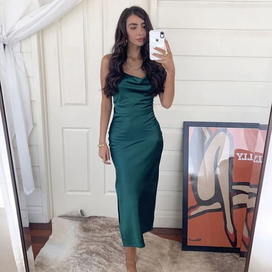 PETITE EMERALD GREEN STRAPPY SATIN COWL MIDI DRESS