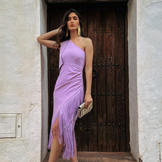 Pretty Girl Lavender One-shoulder Midi Dress With Fringes