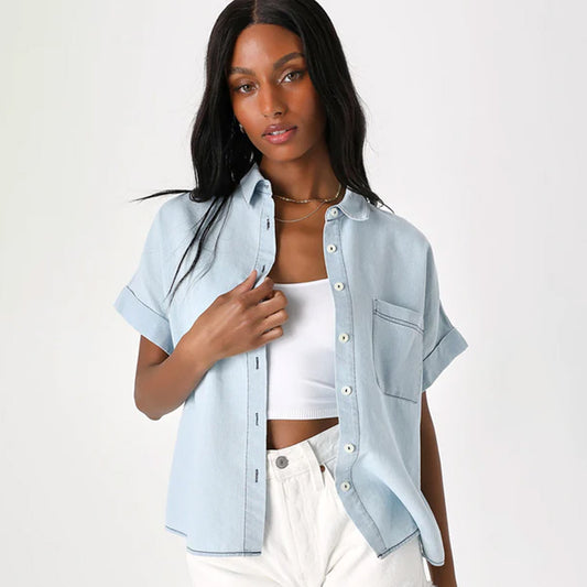 Charmingly Casual Light Blue Chambray Button-Up Top