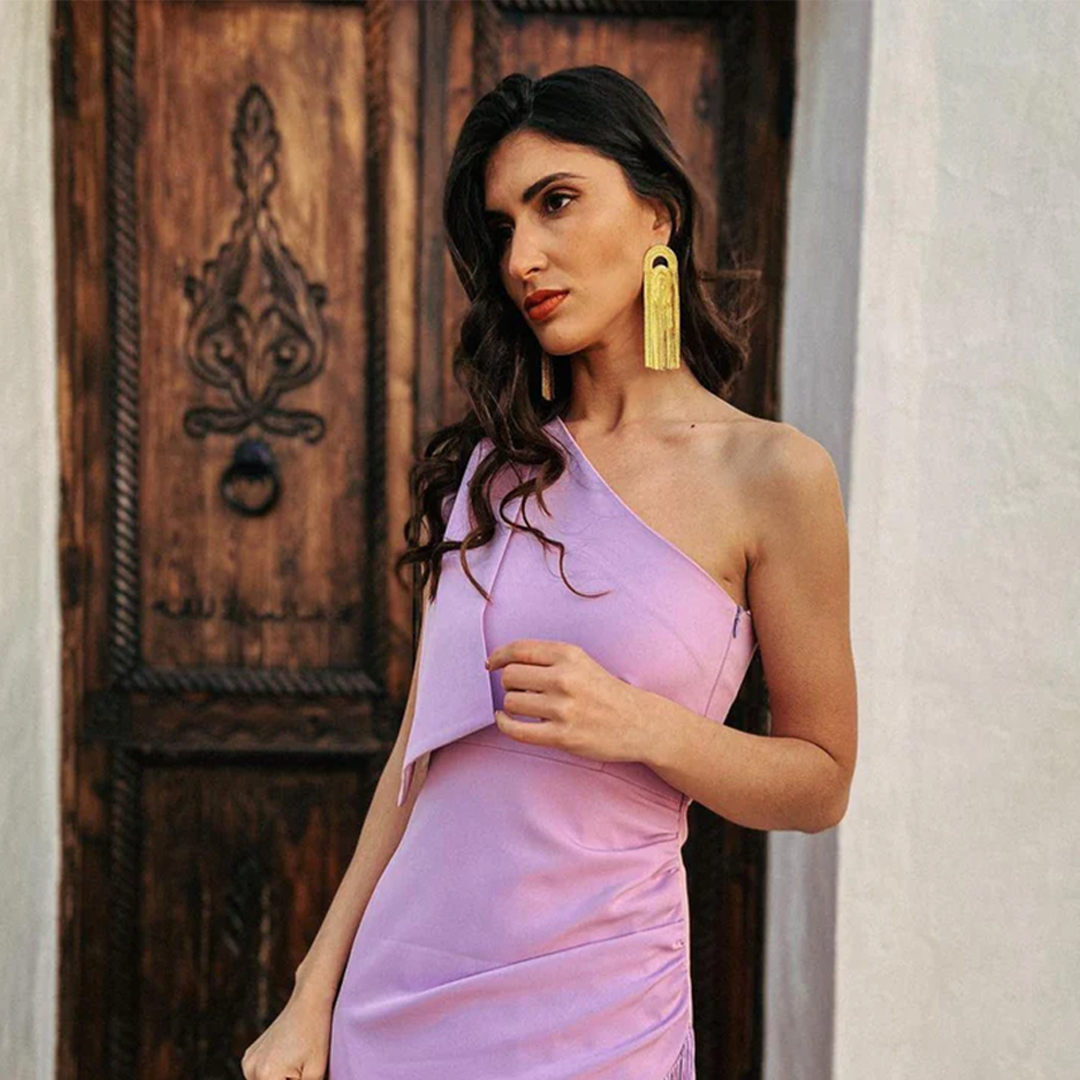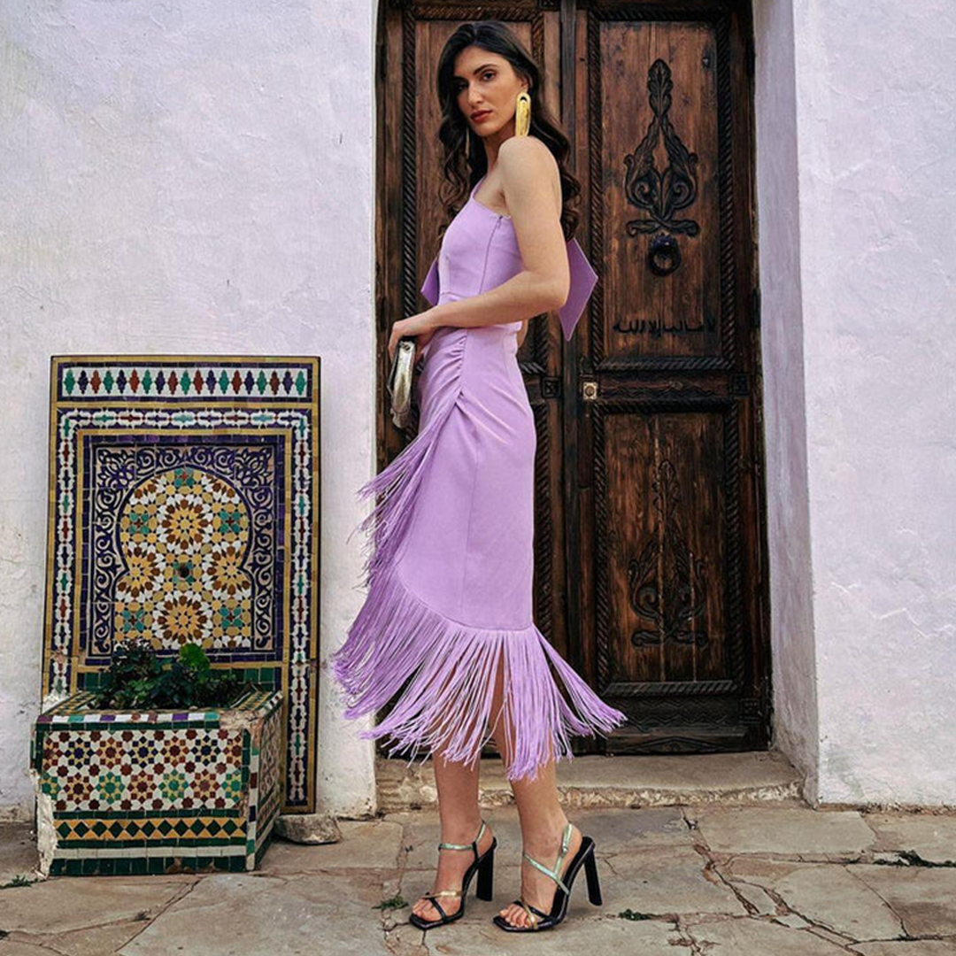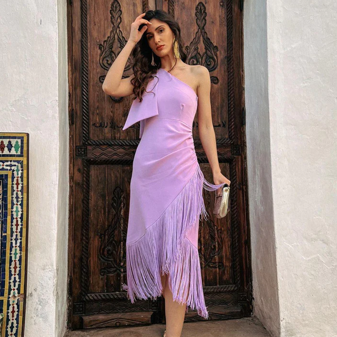 Crafted with meticulous attention to detail, this dress features a one-shoulder design that adds a touch of allure and sophistication. The beautiful lavender hue exudes a sense of femininity and serenity, while the fringed accents create a playful and dynamic movement, adding an extra layer of charm to your every step.