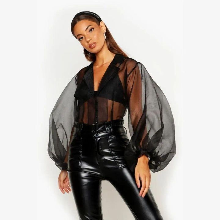 Satin Bustier full Puff Sleeves Black see-through Deep Neck Shirt with Matching Bracelet