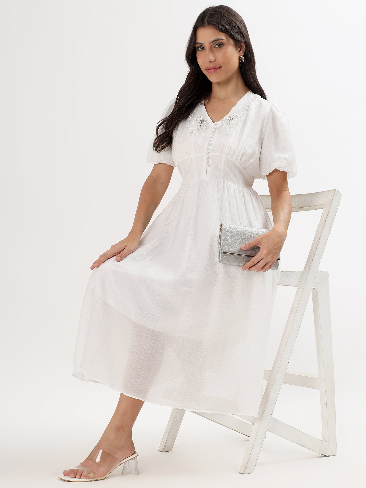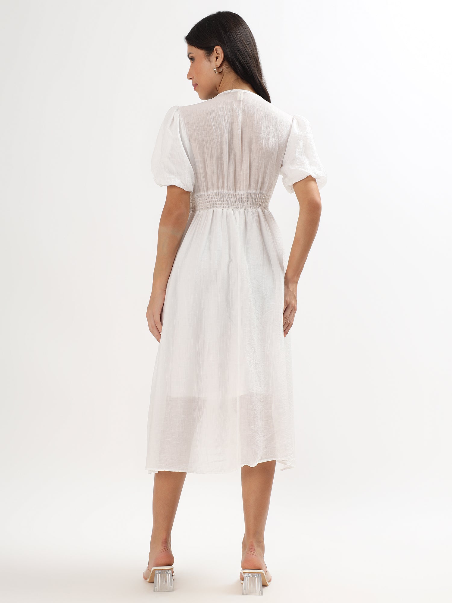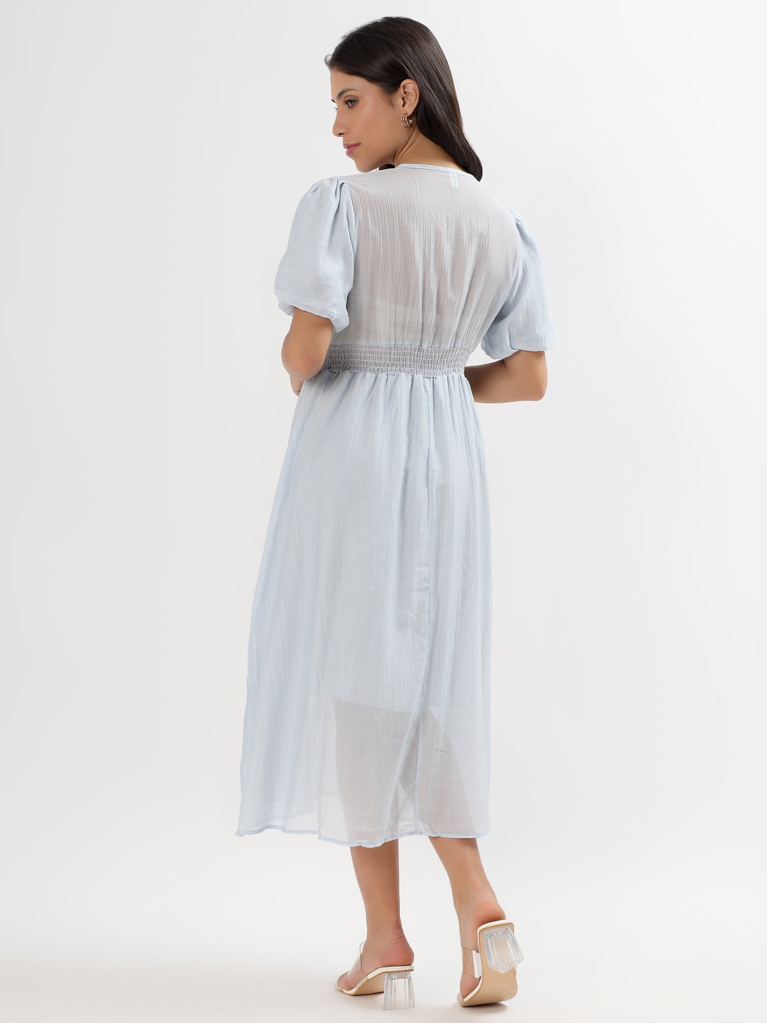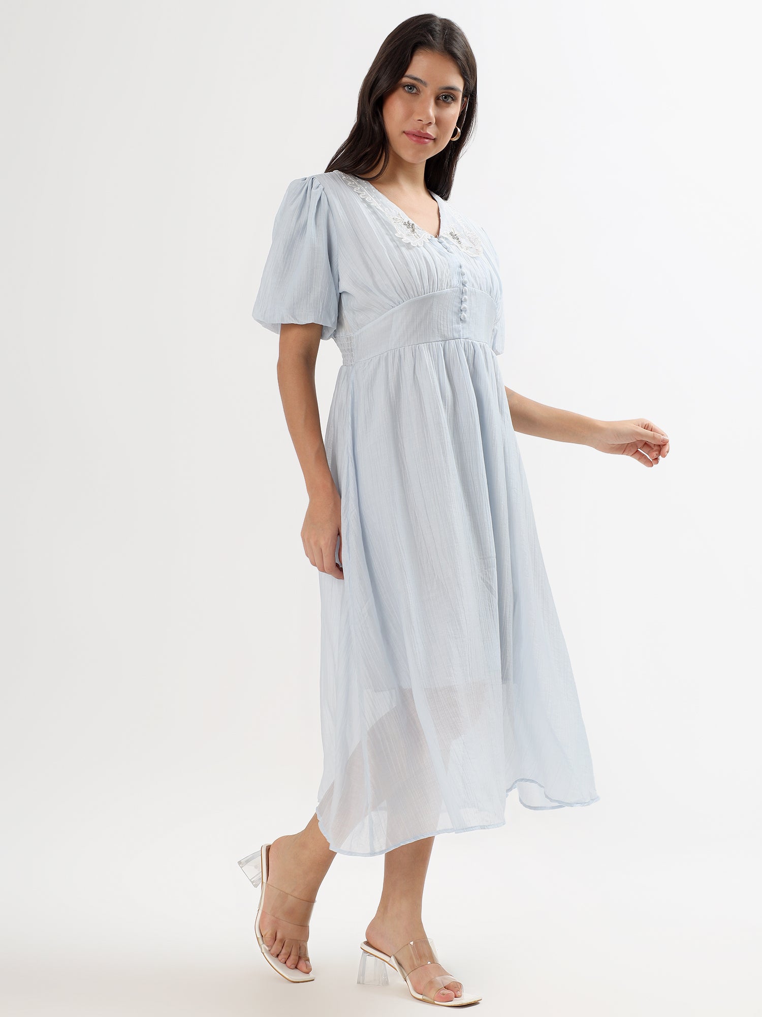 Step into a world of timeless grace with our Pretty Little Lady Midi Dress — where delicate vintage charm meets modern femininity. Crafted in a light, airy fabric with a subtle crinkle texture, this dress floats around you like a soft whisper.