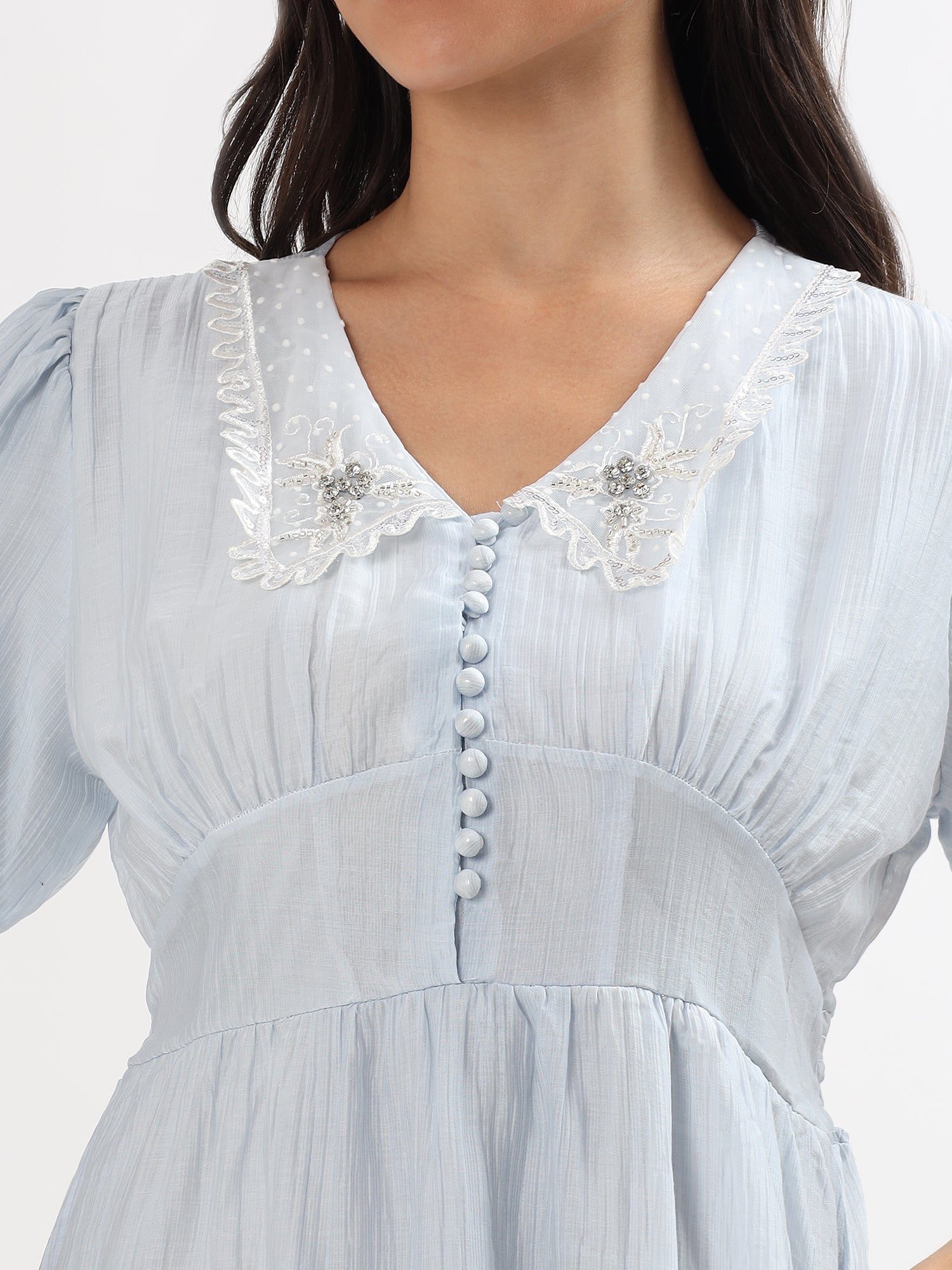 The highlight? A romantically detailed V-neckline with sheer polka mesh and intricate lace embroidery, finished with hand-placed embellishments that sparkle gently. The fabric-covered button detailing down the bodice adds a soft regal touch, while the puffed sleeves and flattering waistline create a dreamy silhouette that suits every body beautifully.